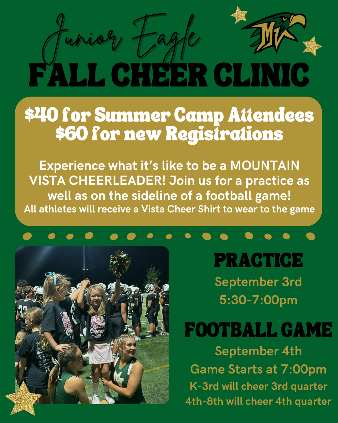 Experience what it's like to be a MOUNTAIN VISTA CHEERLEADER! Join us for a practice as well as on the sideline of a football game!